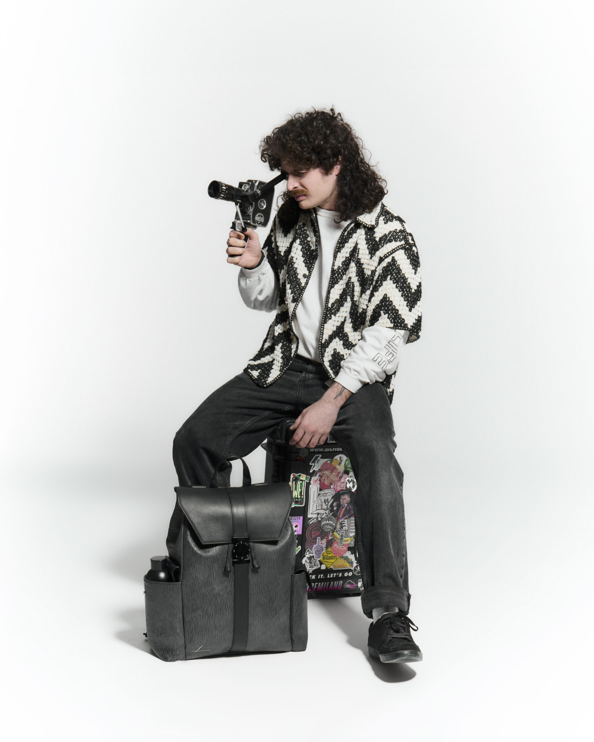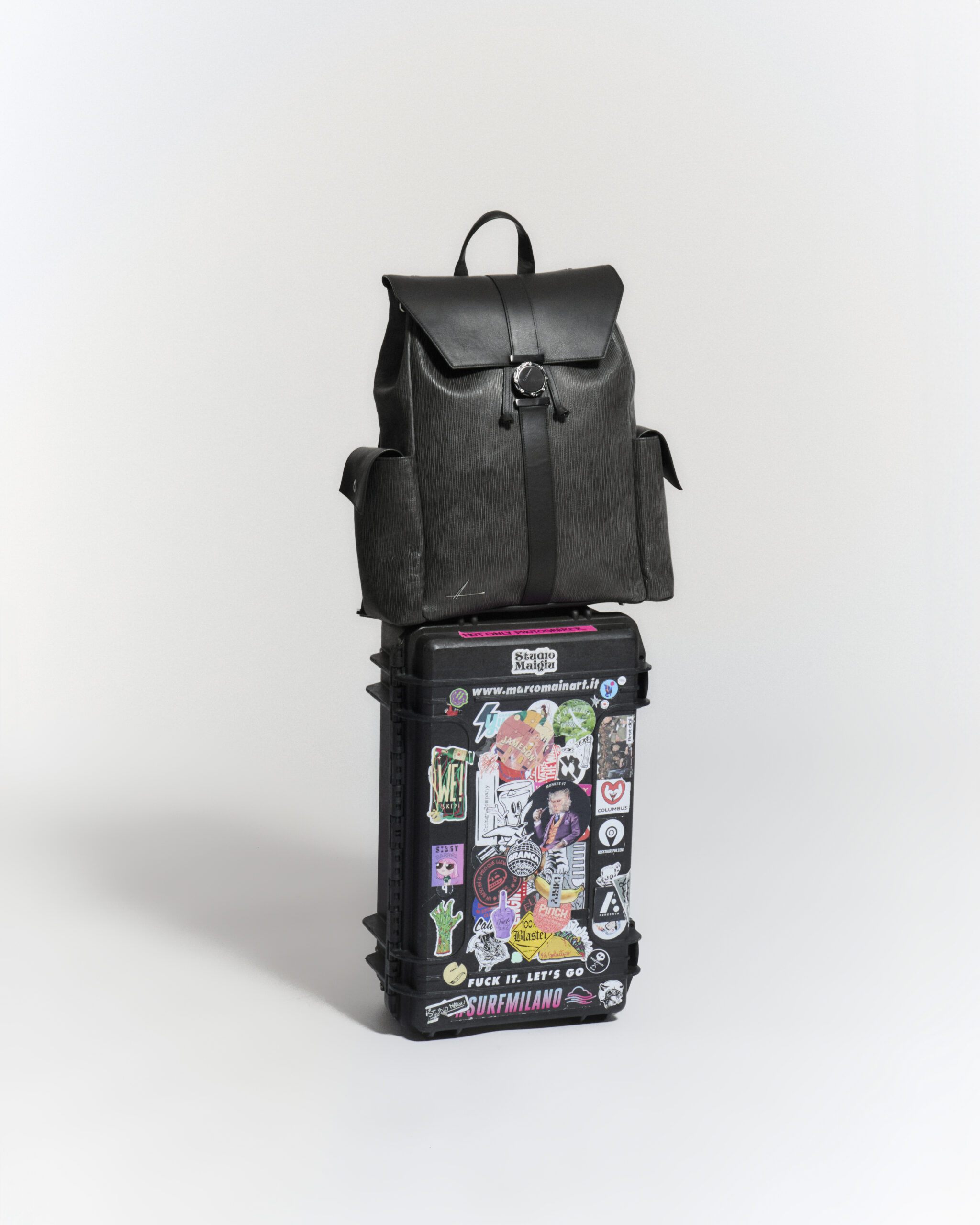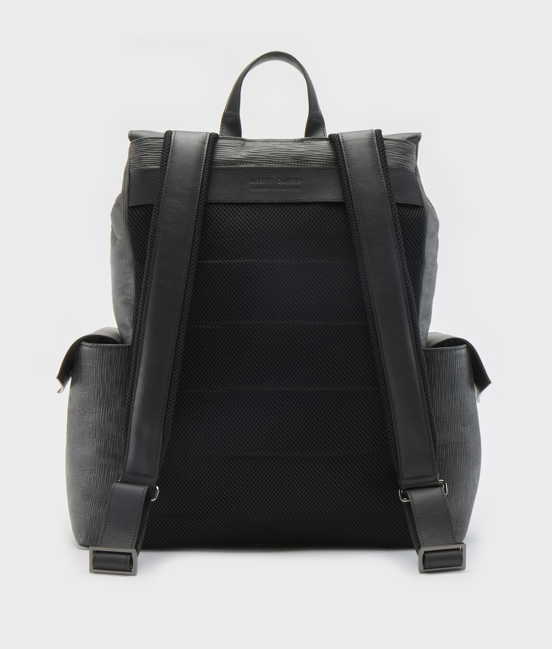 Comodo e capiente, presenta uno schienale imbottito e traspirante per un maggiore comfort, l’accessorio è impreziosito dal logo monogram Alberto Olivero in ottone sul corpo frontale.